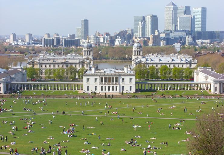 Keywords: greenwich england great britain landscape park grass buildings skyscrapers urban people summer spring nature outside skyline architecture