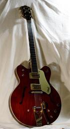 Keywords: Gretsch Country Gentleman 1.jpg Gretsch Country Gentleman 1964 6122 Chet Atkins Country Gentlemen CANON 2008 Own matanao Hollow body 17 inches wide electric archtop Simulated painted f holes ebony fingerboard Name plate on peghead Metal nut 24 1/4 inch scale Stairstep tuner buttons 2 pickup volume knobs on lower bout one for each pickup 1 master volume knob on cutaway 2 tone switches on upper bout Bigsby vibrato and metal bar bridge Gold plated hardware Zero fret and Bone nut Double cutaway body Padded back Double mute with two large mute knobs on either side of bridge Standby switch added on lower bout 1964 Country Gentlemen specs One Super'tron and one Filter'tron pickup Smaller lever-action mute knobs Gold plated Gretsch Bigsby vibrato Gretsch Country Gentleman 6122 Gretsch 1964 models