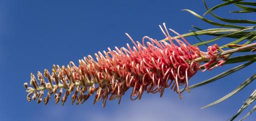 Keywords: grevillea flower australian native pink red nectar shrub garden bloom blue sky