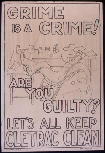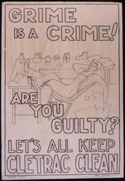| Keywords: Grime is a crime^ Are you guilty^ Let's all keep Cletrac clean. - NARA - 535288.jpg Scope and content General notes 535288 Local identifier 179-WP-1438 Office for Emergency Management War Production Board 01/1942 - 11/03/1945 Still Picture Records Section Special Media Archives Services Division NWCS-S National Archives at College Park 8601 Adelphi Road College Park MD 20740-6001 other date circa 1942 1943 Record group Record Group 179 Records of the War Production Board 1918 - 1947 Record group ARC 508 War Production Board compiled 1942 - 1943 Series ARC 533858 File unit File unit ARC Variant control numbers NAIL Control Number NWDNS-179-WP-1438 Other versions <gallery> File Grime_is_a_crime _Are_you_guilty _Let's_all_keep_Cletrac_clean _-_NARA_-_535288 tif tif File Grime_is_a_crime _Are_you_guilty _Let's_all_keep_Cletrac_clean _-_NARA_-_535288 jpg jpg </gallery> NARA-cooperation PD-USGov World War II safety posters from the United States |