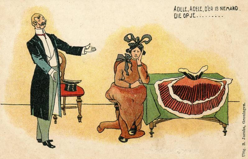 | Keywords: 'k Heb een nichtje, ze heet Adel, 'n Aardig lief meisje, je kent haar wel, 'n Beetje scheel, maar dat hindert niet, Verlief wordt ge daadlijk als g' haar ziet. 'k Zou met haar naar de kermis gaan, Doch deez' grap kwam mij duur te staan, Ach, sprak Adele, 'k durf haast niet, Als men mijn oogen ziet. Adele, Adele, Niemand die op je oogen let, Wij klinken, wij drinken, Met kermis heeft iedereen pret. Zoo gingen wij naar den schouwburg nu heen, Adele was echter vlug ter been. Ze had wel twee beenen, maar wat een kruis, 't Een was van hout en 't and're niet pluis, Eensklaps daar raakten wij in het gedrang Ze fluisterde, Willem, ik word toch zoo bang, Mijn been dat zit los, ik raak het haast kwijt, Ik troostte de aardige meid: Adele, Adele, Niemand die op je beenen let, Wij klinken, wij drinken, Met kermis heeft iedereen pret. Eindelijk kwamen wij in de zaal, Maar lieve Hemel, wat een schandaal, De leuning der loge was veel te laag, Adele haar bochel schoot in de kraag. Zij kon onmogelijk zitten gaan. Engel, dan moet je maar blijven staan, Ach, zuchtte zij, Willem, nooit doe ik het weer, Ik schaam mij, ik schaam mij zoo zeer. Adele, Adele, Niemand die op je bochel let, Wij klinken, wij drinken, Met kermis heeft iedereen pret. Zoo stond nu Adele slechts een korte poos, 'n Heer achter haar werd verschrikkelijk boos, Niets kon hij zien door Adele haar schuld, Nijdig riep hij: pak je weg met je bult. 'k Wierp m' op den kerel, dat was toch mijn plicht Adele werd woedend, vloog m' ook in 't gezicht, Daar verloor zij haar kapsel en stand een, twee, drie Met 'n hoofdje zoo kaal als m'n knie. Adele, Adele, Niemand die op je haaren let, Wij klinken, wij drinken, Met kermis heeft iedereen pret. Het slot van de zaak dat begrijpt u alras 'n Agent van politie kwam juist van pas, Die nam ons beiden mee naar 't bureau, Adele geboeid en ik evenzoo. Met een been, zonder haar, 't was een treurig gezicht, Nee, zoo'n kermis vergeet ik niet licht, Maar toch verloor ik mijn vroolijkheid niet, En 'k zong als refrein van mijn lied: Adele, Adele, Niemand die op je schoonheid let, Wij klinken, wij drinken, Met kermis heeft iedereen pret. 'k Heb een nichtje, ze heet Adel, 'n Aardig lief meisje, je kent haar wel, 'n Beetje scheel, maar dat hindert niet, Verlief wordt ge daadlijk als g' haar ziet. 'k Zou met haar naar de kermis gaan, Doch deez' grap kwam mij duur te staan, Ach, sprak Adele, 'k durf haast niet, Als men mijn oogen ziet. Adele, Adele, Niemand die op je oogen let, Wij klinken, wij drinken, Met kermis heeft iedereen pret. Zoo gingen wij naar den schouwburg nu heen, Adele was echter vlug ter been. Ze had wel twee beenen, maar wat een kruis, 't Een was van hout en 't and're niet pluis, Eensklaps daar raakten wij in het gedrang Ze fluisterde, Willem, ik word toch zoo bang, Mijn been dat zit los, ik raak het haast kwijt, Ik troostte de aardige meid: Adele, Adele, Niemand die op je beenen let, Wij klinken, wij drinken, Met kermis heeft iedereen pret. Eindelijk kwamen wij in de zaal, Maar lieve Hemel, wat een schandaal, De leuning der loge was veel te laag, Adele haar bochel schoot in de kraag. Zij kon onmogelijk zitten gaan. Engel, dan moet je maar blijven staan, Ach, zuchtte zij, Willem, nooit doe ik het weer, Ik schaam mij, ik schaam mij zoo zeer. Adele, Adele, Niemand die op je bochel let, Wij klinken, wij drinken, Met kermis heeft iedereen pret. Zoo stond nu Adele slechts een korte poos, 'n Heer achter haar werd verschrikkelijk boos, Niets kon hij zien door Adele haar schuld, Nijdig riep hij: pak je weg met je bult. 'k Wierp m' op den kerel, dat was toch mijn plicht Adele werd woedend, vloog m' ook in 't gezicht, Daar verloor zij haar kapsel en stand een, twee, drie Met 'n hoofdje zoo kaal als m'n knie. Adele, Adele, Niemand die op je haaren let, Wij klinken, wij drinken, Met kermis heeft iedereen pret. Het slot van de zaak dat begrijpt u alras 'n Agent van politie kwam juist van pas, Die nam ons beiden mee naar 't bureau, Adele geboeid en ik evenzoo. Met een been, zonder haar, 't was een treurig gezicht, Nee, zoo'n kermis vergeet ik niet licht, Maar toch verloor ik mijn vroolijkheid niet, En 'k zong als refrein van mijn lied: Adele, Adele, Niemand die op je schoonheid let, Wij klinken, wij drinken, Met kermis heeft iedereen pret. |