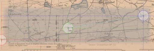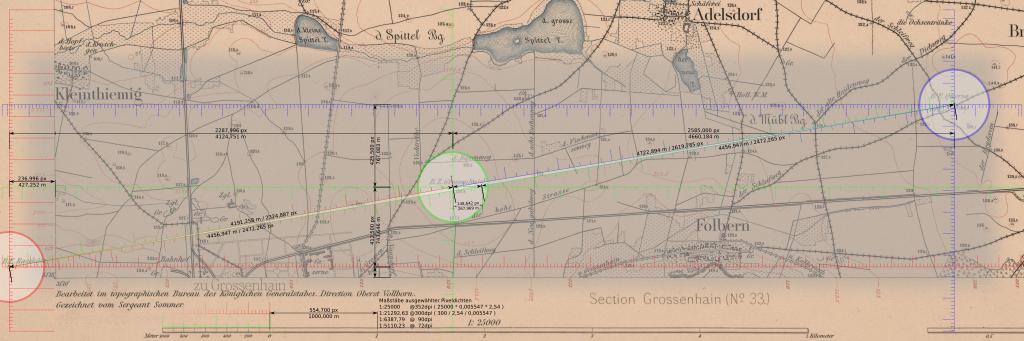 Keywords: Großenhain Basislinie df dk 0000124 dezoomify jpegtran lossless crop annotated.svg en Depicted baseline of the survey points of a saxonian trignonometry net as shown on an projected map of that time The net consists of two endpoints one near Quersa station 32 blue the other near Raschütz station 34 red the base' middle station 33 is on a privately owned airfield formerly used for military purposes The base' middle ground survey point was lost but reconstructed in 2006 Unfortunately the new granit pole is not exactly at the same spot the old one was The image is part of a larger attempt to reconstruct a good approximation of the original position by using the old maps Distances of markers are given in meters and pixel width Großenhainer Grundlinie Basislinie der Vermessungspunkte Triangulationspunkte TP <span style color red; >Basisende Raschütz 34 links im Bild</span> <span style color green; >Basismitte Großenhain 33 im Bild mittig</span> und <span style color blue; >Basisende Quersa 32 rechts östlich im Kartenausschnitt</span> der Königlich-Sächsischen Triangulation Zu sehen sind alle wichtigen Abstände und Maßstäbe bezüglich der drei Basispunkte Die dank Inkscape subpixel-genauen Messungen lassen sich durch die Aktivierung von Gitternetz <code> </code> und/oder Führungslinien <code><nowiki> </nowiki></code> im Programm leicht nachvollziehen Quellenangabe für das zugrundeliegende Rasterbild <br/><code>Blatt 18 Section Skässchen - Hirschfeld Ausgabe 1882 der Topopgraphischen Karte Äquidistantenkarte Sachsen bearbeitet im topographischen Bureau des Königlichen Generalstabes - 1 25000 - 156 Blatt versch Auflagen 1874-1918 - Leipzig Giesecke Devrient - Je Blatt 46 x 44 cm </code> Äquidistantenkarten sind Basis für darauf folgende TK25 Messtischblätter Erstellung des zugrundeliegenden Kartenausschnitts verlustlos mit jpegtran <syntaxhighlight lang bash > lossless d/l python3 dezoomify py -v -t 2 -j /jpegtran \ -b http //fotothek slub-dresden de/zooms/df/dk/0000000/df_dk_0000124/ \ messtischblaetter-sachsen-1870-1943/df_dk_0000124_dezoomify jpg lossless crop of relevant area jpegtran -perfect -crop 5280x1760+368+5408 \ -outfile Großenhain_Basislinie_df_dk_0000124_dezoomify_jpegtran_lossless_crop jpg \ messtischblaetter-sachsen-1870-1943/df_dk_0000124_dezoomify jpg </syntaxhighlight> own derived work based on http //www deutschefotothek de/obj70302464 html df_dk_0000124 in Deutsche Fotothek Cmuelle8 2013-09-04 Cc-zero Königlich Sächsische Triangulation ~Dreiecksnetz Großenhain |
