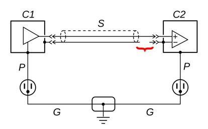 | Keywords: Ground loop solution - broken shield.svg ground loop is an inadvertent electrical circuit or loop created by the ground wiring of electrical equipment Ground loops are a major cause of hum and interference in audio video and computer equipment because circulating currents induced by stray magnetic fields from nearby 50/60 Hz equipment can cause AC voltage dropped across signal grounds In this diagram two AC powered electronic components C1 and C2 are connected by a shielded signal cable S The ground shield of S along with the ground wire third wire P in the components' power cord and the building's utility ground wiring G form a ground loop By breaking the shield conductor <font color red >red</font> between the two components the loop is broken preventing the ground loop current from flowing The shield should be broken at the load or destination end of the cable C2 not the source C1 This solution works as long as both components are grounded to the building wiring but if one of the components does not have a ground wire in its power cord it will be totally ungrounded floating and AC leakage currents will result in very loud hum in audio signals Information and circuit from Larry Robinson http //midimagic sgc-hosting com/gndloop htm About Ground Loops MidiMagic website 2014-01-20 13 07 59 own Chetvorno cc-zero Uploaded with UploadWizard Ground loops |