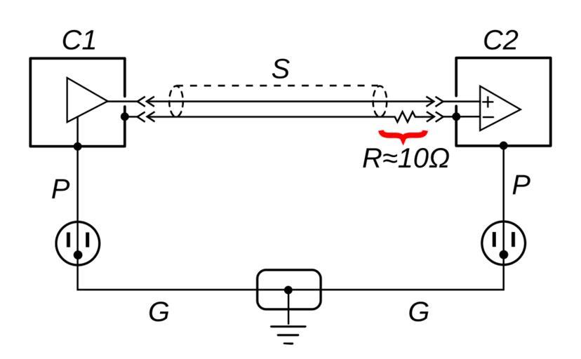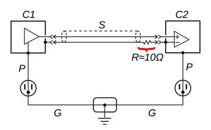| Keywords: Ground loop solution - resistor.svg ground loop is an inadvertent electrical circuit or loop created by the ground wiring of electrical equipment Ground loops are a major cause of hum and interference in audio video and computer equipment because circulating currents induced by stray magnetic fields from nearby 50/60 Hz equipment can cause AC voltage dropped across signal grounds In this diagram two AC powered electronic components C1 and C2 are connected by a shielded signal cable S The ground shield of S along with the ground wire third wire P in the components' power cord and the building's utility ground wiring G form a ground loop <br /> Inserting a 10Ω resistor <font color red >red</font> in the ground shield conductor of the cable S is enough to prevent the ground loop current from flowing This solution is better than simply creating a break in the cable's ground shield because if one of the components doesn't have a ground wire third wire P in its power cable the resistance is low enough that the component will still be kept effectively at signal ground potential through S This prevents it from being totally ungrounded floating which would cause loud hum or interference Information and circuit from Larry Robinson http //midimagic sgc-hosting com/gndloop htm About Ground Loops MidiMagic website 2014-01-20 13 41 29 own Chetvorno cc-zero Uploaded with UploadWizard Ground loops |