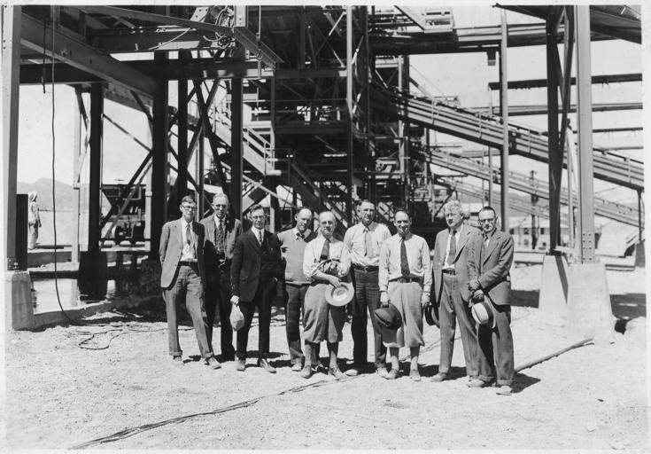 | Keywords: "Group including members of the Concrete Consulting Board at the Six Companies' screening and washing plant. From... - NARA - 293630.jpg Scope and content Photograph from Volume Two of a series of photo albums documenting the construction of Hoover Dam Boulder City Nevada General notes 293630 Local identifier Department of the Interior Bureau of Reclamation Engineering and Research Center 05/18/1981 - 03/04/1988 NARA's Rocky Mountain Region Denver NRGA Building 48 Denver Federal Center West 6th Avenue and Kipling Street Denver CO 80225-0307 1932-04-01 Record group Record Group 115 Records of the Bureau of Reclamation 1889 - 2008 Record group ARC 444 Photograph albums compiled 1903 - 1972 Series ARC 293611 File unit File unit ARC Variant control numbers NAIL Control Number NRG-115-CONSTPHO85006-BC21125 Other versions <gallery> File Group_including_members_of_the_Concrete_Consulting_Board_at_the_Six_Companies'_screening_and_washing_plant _From _-_NARA_-_293630 tif tif File Group_including_members_of_the_Concrete_Consulting_Board_at_the_Six_Companies'_screening_and_washing_plant _From _-_NARA_-_293630 jpg jpg </gallery> NARA-cooperation PD-USGov People associated with the construction of Hoover Dam Six Companies Inc installations at Hoover Dam construction site |