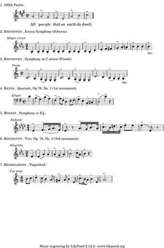 | Keywords: Grove 1900 p12.png en Dictionary of Music Musicians edited by Grove 1900 Vol 1 p12 For the article ACCENT Book is on Wikisource Created in Lilypond 2 12 2 from music in Grove's Dictionary 1900 p12 User Beeswaxcandle 2009-07-19 <pre> Grove 1900 Vol 1 p 12 ACCENT \version 2 12 2-1 \markup 1 100th Psalm << \relative c \clef treble \key a \major \time 2/2 \partial 2 1 a2 a \markup \bold gis fis \markup \bold e a \markup \bold b cis \markup \bold \bar \addlyrics All peo -- ple that on earth do dwell >> \markup 2 \smallCaps Beethoven Eroica Symphony Scherzo \relative c' \clef treble \key ees \major \time 3/4 \override Score RehearsalMark 'break-align-symbol 'time-signature \mark \markup \small \italic Allegro vivace \partial 4 1 bes4- bes- \markup \bold c- bes- c- \markup \bold bes- c- bes- \markup \bold c- bes- c- \markup \bold bes- d- ees- \markup \bold f- fis- g- \markup \bold aes- a- bes- \markup \bold bes- bes- bes- \markup \bold -\markup etc \markup 3 \smallCaps Beethoven Symphony in C minor Finale \relative c' \clef treble \key c \major \time 2/2 \override Score RehearsalMark 'break-align-symbol 'time-signature \mark \markup \small \italic Presto c2 \markup \bold b4 a \markup \bold g g- g- c2 \markup \bold b4 a \markup \bold g g- g- e'2 \markup \bold d4 c \markup \bold b b- b- -\markup etc \markup 4 \smallCaps Haydn Quartett Op 76 No 1 1st movement \relative c' \clef bass \key g \major \time 2/2 \override Score RehearsalMark 'break-align-symbol 'time-signature \mark \markup \small \italic Allegro \partial 4 1 d4 b \markup \bold g c \markup a fis \markup \bold a8 fis- d4 \markup e8- fis- g4- \markup \bold e- b- \markup cis- d2 \markup \bold d'4 \markup r4 \markup 5 \smallCaps Mozart Symphony in E\flat \relative c' \clef treble \key aes \major \time 2/4 \override Score RehearsalMark 'break-align-symbol 'time-signature \mark \markup \small \italic Andante ees4 \markup \bold f16 \markup g32 aes16 f32 ees8 \markup \bold r8 aes16 \markup g32 bes16 aes32 c16 \markup \bold bes32 d16 c32 ees8 \markup ees ees4 \markup \bold ees 8 \markup r8 \markup 6 \smallCaps Beethoven Trio Op 70 No 2 3rd movement \relative c' \clef treble \key ees \major \time 3/4 \override Score RehearsalMark 'break-align-symbol 'time-signature \mark \markup \small \italic Allegretto \partial 4 1 ees4 \markup ees \markup \bold aes aes \markup aes \markup \bold g aes \markup \bold bes2 \markup \bold c8 \markup aes bes4 \markup \bold r4 \markup 7 \smallCaps Mendelssohn Pagenlied \relative c \clef treble \key c \major \time 6/8 \override Score RehearsalMark 'break-align-symbol 'time-signature \mark \markup \small \italic Con moto \partial 8 2 b8 c d4 \markup \bold c8 b4 \markup a8 gis4 \markup \bold a8 b4 \markup e 8 c'8 \markup \bold b16 a8 b4 \markup e 8 a2 \markup \bold </pre> Dictionary of Music and Musicians 1900 Lilypond images Uncategorized 2015 January 2 |