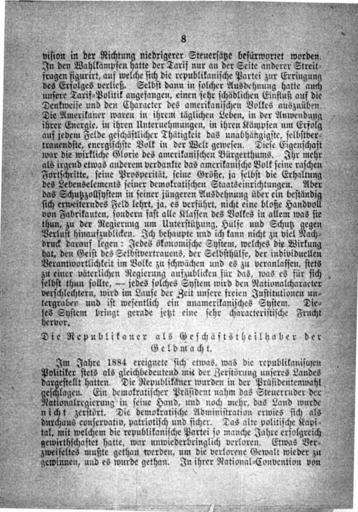 Keywords: Grover-Cleveland-1892-de-p08.JPG en Image of page 08 of the pamphlet Carl Schurz an die Wähler ohne Unterschied der Partei Warum sie für Cleveland stimmen sollen Pamphlet courtesy of the Boston Public Library Carl Schurz 1892-09-08 PD-old Warum die Wähler für Cleveland stimmen sollen Seitebilder |