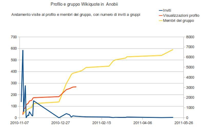 | Keywords: Gruppo Wikiquote di aNobii, andamento membri.png it Grafico del numero di visualizzazioni del profilo e di iscritti al gruppo di Wikiquote in italiano in aNobii correlati al numero di inviti In ordinata a sinistra inviti e visualizzazioni totali a destra gli inviti di quel giorno Fino al 12 novembre 2010 sono incluse migliaia di inviti a gruppi diversi da quello su Wikiquote da parte dell'utenza Wikiquote mentre in seguito gli inviti sono stati inviati prevalentemente da un'altra utenza own Nemo bis 2011-02-24 Cc-zero Wikiquote statistics Wikimedia Italia |