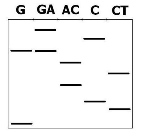 Keywords: GTCATAGCA in maxam gilbert sequencing.jpeg en Electrophoresis of short sequences created by Maxam-Gilbert sequencing technique The primary sequence GTCATAGCA is read from the bottom of the polyacrylamide gel own Vojtech dostal 2009-08-27 Electrophoresis |