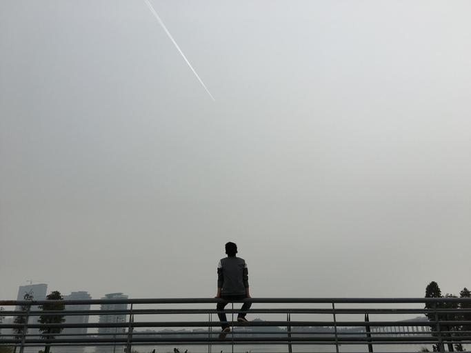 Keywords: guangzhou university city rain riverside male people rear view the urban landscape bridge lonely sad a separate