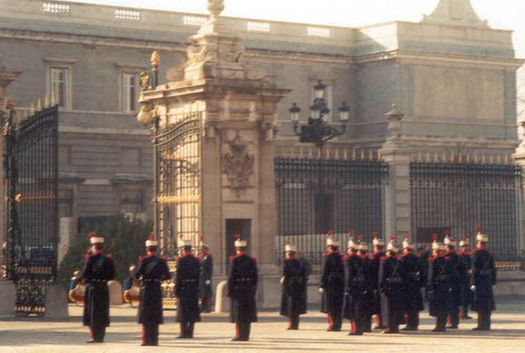 Keywords: Guardias reales en 2001.jpg Guardias reales a caballo en Madrid own 2001 Jean Körp public domaine Exterior of the Royal Palace of Madrid People of Spain Changing of the Guard Royal Palace of Madrid Plaza de la Armería Madrid