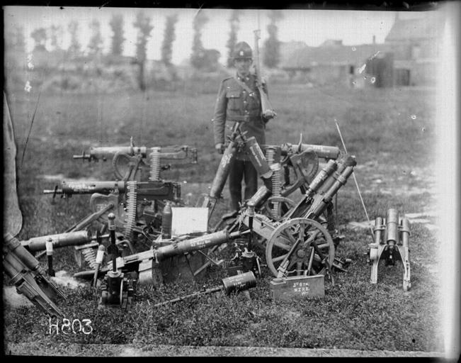 Keywords: blackandwhite monochrome photo border outdoor bike vehicle surreal black and white A New Zealand soldier guards the guns captured by New Zealand troops at Messines, Belgium during World War I. There are several machine guns among the weapons. Photograph taken Bailleul, France, 14 June 1918 by Henry Armytage Sanders. Inscriptions: Inscribed - Photographer's title on negative -bottom left: H803. Quantity: 1 b&w original negative(s). Physical Description: Dry plate glass negative 4 x 5 inches Guarding the guns captured at Messines, World War I. Royal New Zealand Returned and Services' Association :New Zealand official negatives, World War 1914-1918. Ref: 1/2-013390-G. Alexander Turnbull Library, Wellington, New Zealand. natlib.govt.nz/records/23212221 A New Zealand soldier guards the guns captured by New Zealand troops at Messines, Belgium during World War I. There are several machine guns among the weapons. Photograph taken Bailleul, France, 14 June 1918 by Henry Armytage Sanders. Inscriptions: Inscribed - Photographer's title on negative -bottom left: H803. Quantity: 1 b&w original negative(s). Physical Description: Dry plate glass negative 4 x 5 inches Guarding the guns captured at Messines, World War I. Royal New Zealand Returned and Services' Association :New Zealand official negatives, World War 1914-1918. Ref: 1/2-013390-G. Alexander Turnbull Library, Wellington, New Zealand. natlib.govt.nz/records/23212221 |