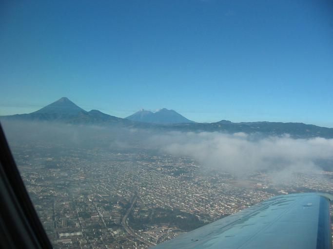 Keywords: Guatemalavolcanes.JPG View of the Guatemala City valley Valle de la Asunción Own 2003-12-23 Alphabet Citizen 2003 in Guatemala City Pacaya Volcán de Agua Aerial photographs of Guatemala City