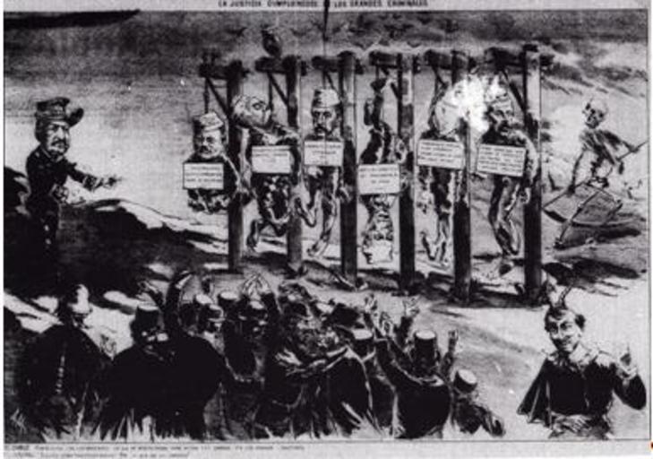 Keywords: Guerra del pacífico 1879-1884 Caricatura 77.jpg es Patricio Ibarra Cifuentes escribió La justicia cumpliéndose a los grandes criminales se intitula esta caricatura publicada en El Diablo el 22 de junio de 1881 la cual muestra en la horca a connotados personajes de la política chilena de la época acusados por el Diablo abajo a la derecha de aspecto irónico y distinguido de intentar meter sus garras en las riquezas provenientes del huano y salitre recién conquistado por el Ejército chileno Entre los ajusticiados se cuenta a Benjamín Vicuña Mackenna Justo Arteaga Alemparte y el ex presidente José Joaquín Pérez quien se encuentra colgado de los pies entre otros Del cuello de cada uno de ellos cuelga un cartel donde se lee el delito por el cual fue condenado Por ejemplo al polígrafo y por esos años senador Vicuña Mackenna se le acusa de fanfarrón calumniador embustero trapalón y loco Por su parte el general Manuel Baquedano de pie a la derecha aliviado declara haberse librado de ellos pues eran partidarios de su llegada a La Moneda la cual se frustró luego de la aparición de las candidaturas oficialistas de José Francisco Vergara y Domingo Santa María La muerte y una turba probablemente representando a la opinión pública chilena observan la escena 1879-1884 http //www tesis uchile cl/tesis/uchile/2009/ibarra_pa/html/TH 4 html Chilean magazines El Ferrocarrilito El Padre Cobos El Diablo José Peluca El Barbero El Corvo Padre Padilla Diógenes other versions PD-old-70-1923 Chilean Caricatures in the War of the Pacific |