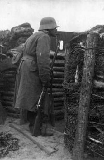 | Keywords: Guerre 14-18-Sentinelle allemande dans la tranchée-vers1915.JPG Postcard of Germany - German Army - A German soldier supervises since his trench His posture is bent over because he does not want to raise his head into the line of fire The Stahlhelm was introduced on 1st of june 1916 so it's latter dated Postal de Alemania - Ejército Alemán - Un soldado alemán supervisa desde su trinchera Su actitud es prudente porque no quiere elevar su cabeza para observar - Año desconocido aproximadamente 1916 Carte postale allemande - Armée allemande - Un soldat allemand surveille depuis sa tranchée Son attitude est pudente car il veut pas relever la tête pour observer - Année inconnue environ 1916 PD-old Old military postcards of Germany Soldiers World War I postcards of German Empire Soldiers World War I trench warfare World War I forces of Germany Earth fortifications Stahlhelm |