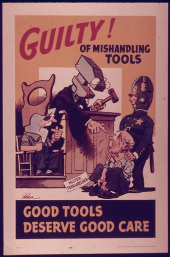 | Keywords: "Guilty^ Of Mishandling Tools..Good Tools Deserve Good Care." - NARA - 514431.jpg Scope and content General notes 514431 Local identifier 44-PA-925 Office for Emergency Management Office of War Information Domestic Operations Branch Bureau of Special Services 03/09/1943 - 09/15/1945 NARA-Author Packer poster artist Artist 8467744 <br /> Still Picture Records Section Special Media Archives Services Division NWCS-S National Archives at College Park 8601 Adelphi Road College Park MD 20740-6001 1941 - 1945 Record group Record Group 44 Records of the Office of Government Reports 1932 - 1947 Record group ARC 373 World War II Posters compiled 1942 - 1945 Series ARC 513498 File unit File unit ARC Variant control numbers NAIL Control Number NWDNS-44-PA-925 Other versions <gallery> File Guilty _Of_Mishandling_Tools Good_Tools_Deserve_Good_Care _-_NARA_-_514431 tif tif File Guilty _Of_Mishandling_Tools Good_Tools_Deserve_Good_Care _-_NARA_-_514431 jpg jpg </gallery> NARA-cooperation PD-USGov World War II posters about tools from the United States Guilt |