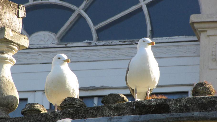 Keywords: gulls bird sea water animal seevogel sky close home roof curiosity nature summer spring white watch