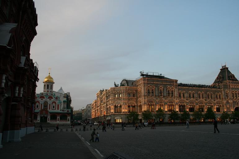 Keywords: gum department store building architecture ornate arched windows roof black lights red square paving historic red brick buidlings sky