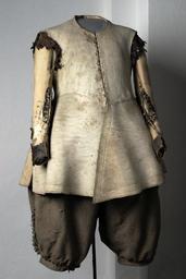 | Keywords: Gustav II Adolfs dräkt från slaget vid Dirschau, 1627 - Livrustkammaren - 56717.tif Kyller använt av Gustav II Adolf vid Dirschau den 6 augusti 1627 w Buff coat used by Gustavus Adolphus of Sweden at the Kyller av älghud med ärmar av siden numera endast fragment kvar Kyllret är kraglöst och avskuren i midjan med långa skört 4 stycken <br/><br/>Längd mitt fram liv 36 5 cm skört 41 5 cm <br/>Bröstvidd 105 cm <br/>Längd mitt bak liv 41 5 cm skört 40 5 cm <br/>Ryggbredd 40 cm <br/>Midja 106 cm <br/>Vidd skörtens nederkant 281 cm <br/>Längd i sida liv 24 cm skört 43 3 cm <br/>Axelbredd 17 6 cm <br/>Ärmlängd 69 cm största ärmvidd 34 cm ärmvidd nedtill 28 cm <br/>Ärmsprundet är 18 cm Åtta knapphål vänster ärm har 4 silvertrådsklädda knappar och höger ärm har 7 knappar kvar <br/>Ärmens innersöm har en 15 5 cm lång öppning med 8 öglor av silvertråd på var sida över var ögla sitter en sydd träns av sysilke <br/><br/>Sömmarna runt framkant hals på axlar och längs skörtens sidor är dekorationsstickade med tre parallella sömmar i vit lintråd Snörning mitt fram med nio grupper med två hål i varje grupp på var sida Snörningen har blodfläckar Skörtets söm mitt bak på höger bakstycke har gått upp ca 1 cm Ärmarna har rester av sitt yttertyg ett ljust brun atlas samt ett foder av ljust brun taft Kyllret har axelkarmar och endast mycket små rester av atlasen finns kvar däremot återstår det mörkt bruna kanvasen som utgjort mellanlägg i tre lager tyg Kanvasen är belagd med en yta för styvnadens skull Livet i kyllret är fodrat med vitt linne förmodligen som mellanfoder w Buff coat of elk hide with sleeves made of silk of which now only fragments remain The coat is collarless and seamed at the waist with long skirts in four pieces Center front length body 36 5 cm 41 5 cm skirts Chest 105 cm Center back length 41 5 cm body skirts 40 5 cm Back width 40 cm Waist 106 cm Width skirt hem 281 cm Length at side body 24 cm 43 3 cm skirts Shoulder Width 17 6 cm Sleeve length 69 cm Maximum sleeve width 34 cm Sleeve width at bottom 28 cm Sleeve opening 18 cm Sleeves have eight buttonholes; the left sleeve has four silver-wrapped thread covered buttons and the right sleeve has seven buttons left The coat's inseam has a 15 5 cm long opening with 8 loops of silver wire On each side of the loop is a stitched tack of sewing silk The seams around the front edge of the neck the shoulders and along the sides of skirt are decorated with three parallel rows of stitching in white linen thread The lacing at the front has nine groups of two holes in each group on each side The lacing has blood stains Skirt seam at center back on the right rear panel has gone up about 1 cm The sleeves have the remains of their outer shell a light brown silk atlas satin and a lining of light brown taffeta The coat has shoulder wings with only small remnants of the atlas remaining over the dark brown the canvas that formed inserts in the three-layer fabric The canvas is coated with a surface for stiffenings' sake The body of the coat is lined with white linen presumably as interlining original caption Gustav II Adolfs dräkt från slaget vid Dirschau 1627 - LRK 31194<br/> Nyckelord Älgskinn Trettioåriga kriget Rock Gustav II Adolfs Föremålsbild Slaget vid Dirschau Battle of Dirschau 1627 silk d1 - dräkt - yttermaterial material siden size mm 365 mitt fram LRK Gustav II Adolf av Sverige Gustavus Adolphus of Sweden Basutställning Gustav II Adolf Minnesutställning 1932 1932 place of origin original filename lm_dig0487 67807 inventory number LRK 31194 56717 CC-BY-SA Göran Schmidt <gallery caption Different images of same object > File Kyller Dirschau - Livrustkammaren - 60031 tif File Kyller använt av Gustav II Adolf vid Dirschau den 6 augusti 1627 - Livrustkammaren - 61181 tif File Detaljbild på axelstycke Gustav II Adolfs älghudsskyller från Dirschau år 1627 - Livrustkammaren - 65278 tif File Detaljbild på ärm Gustav II Adolfs älghudsskyller från Dirschau år 1627 - Livrustkammaren - 22477 tif File Kyller Dirschau - Livrustkammaren - 42910 tif File Kyller använt av Gustav II Adolf vid Dirschau den 6 augusti 1627 - Livrustkammaren - 44060 tif File Kyller använt av Gustav II Adolf vid Dirschau den 6 augusti 1627 - Livrustkammaren - 35501 tif File Detaljbild ena armen på Gustav II Adolfs älghudsskyller från Dirschau år 1627 - Livrustkammaren - 73840 tif File Detaljbild på tyg Gustav II Adolfs älghudskyller från Dirschau år 1627 - Livrustkammaren - 13914 tif File Kyller Dirschau - Livrustkammaren - 51470 tif File Kyller använt av Gustav II Adolf vid Dirschau den 6 augusti 1627 - Livrustkammaren - 52620 tif </gallery> Göran Schmidt Buff coats Gustav II Adolf of Sweden Media contributed by LSH unmatched event Media contributed by LSH unmatched material Media contributed by LSH unmatched objKeyword Media contributed by LSH unmatched keyword Color images from Livrustkammaren Clothes of Gustav II Adolf Media contributed by LSH 2013-10 |