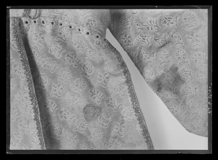 | Keywords: Gustav II Adolfs sveptröja - svepdräkt - Livrustkammaren - 52603.tif Gustav II Adolf av Sverige plain text Tröja av guldbrokad på silverbotten Mönsterrapport 7 6 x 7 6 cm Foder av citrongult atlassiden <br/>8 stora skört <br/>Ärmsprund i inre söm ca 28 cm så gott som omedelbart uppifrån Runt kanten löper en 9 mm bred knypplad silverspets med uddar i ena kanten 2 inlagda 1 mm breda silverlan <br/>Skörten har snörhål och det är smala silvertränsar vid midjan intill spetsarna som betonar vertikallinjen i sidan framtill Kragen har 4 tränsar på vänster sida <br/>Ärmarna har nedtill 12 knapphål till små metalltrådsknappar Ärmarnas nederkanter kragen och framstyckena skodda med ripsband Tröjan har inlagd planschett och är stofferad I midjan sitter 8 stycken ca 4 cm långa och 2 cm breda tampar klädda med gul atlas och försedda med vardera 1 hål Längs de långa ärmsprunden har små knappar suttit i tät rad på ömse sidor - 2 knappar diam 8 mm framtill av guld- och silvertråd är allt vad som återstår på H ärm rest vid framstycket <br/>Tröjan har framtill knappslå med en obruten rad om 29 knappar - 2 cm långa knapphål på vänster sida à 1 5 cm långa och sydda med ljust silke mellan 2 parallella silverspetsar <br/>På höger ärm finns de 7 nedersta ärmknapparna kvar på vänster ärm de 6 nedersta <br/>Invändigt har framstyckena försetts med en triangulär planschett på vilken en lös tamp klädd med de gula fodersidenet sytts Den har utåt vidgad runddad form och har ett hål <br/>Tröjan har blivit uppklippt i ryggen bak kragen och övre ryggparti 5 + 5 5 slarvigt hopsydd Längs vänster sidans ryggstycke löper den silver spets som brukar dekorera plagget Det förefaller som om knappar också sytts här av spåren att döma Tröjan har sannolikt ursprungligen haft ett 24 cm långt sprund 8 cm från nederkanten och uppåt <br/>Det fjärde skörtet framifrån på höger sida d v s det som sträcker sig längst bakåt saknar silverspets - den har sprättats bort - man ser silvertrådarna <br/>Även träns för gehäng ca 22 cm intill vänster sidosöm c 1 cm in på det förlängda framstycket 22 mm från nederkanten <br/>Axelkarmarna är 49 5 cm långa dvs lämnar 10 cm av ärmringningen bar och 3 cm breda max <br/>Spår av blod eller kropsvätska på vänster sida i ryggen och vänster ärm <br/>Svart yllemellanfoder i skörten <br/>Mellanfoder av vit lärft <br/>Kragens höjd fram 5 7 cm bak 4 5 cm<br/>axelsöm l 19 cm Doublet of gold brocade on a silver ground lined in lemon yellow satin with small metal buttons and silver lace The brocade pattern repeat is 7 6 x 7 6 cm The doublet is stiffened with whalebone Eight skirts or tabs are padded with black wool batting beneath the lining of white linen tabby Detail view of the eyelets for ribbon points at the waist original caption Slaget vid Lützen 1632 LRK Gustav II Adolf av Sverige Gustavus Adolphus of Sweden Modelejon 2002 Utst Schwedenzeit in Pommern staden Wolgasts 750-årsjubileum 2007 place of origin original filename LN_B09526_012406 67774 inventory number LRK 31142 52603 CC0 Gustav II Adolfs sveptröja - svepdräkt - Livrustkammaren - 52603-negative tif <gallery caption Different images of same object > File Gustav II Adolfs sveptröja - svepdräkt - Livrustkammaren - 69726 tif File Gustav II Adolfs sveptröja - svepdräkt - Livrustkammaren - 9800 tif File Sveptröja - Livrustkammaren - 42990 tif File Sveptröja - Livrustkammaren - 34432 tif File Gustav II Adolfs sveptröja - svepdräkt - Livrustkammaren - 78285 tif File Gustav II Adolfs sveptröja - svepdräkt - Livrustkammaren - 61164 tif File Gustav II Adolfs sveptröja - svepdräkt - Livrustkammaren - 1240 tif File Gustav II Adofs svepkläder Bild tagen i utställningsmontern i rum A med antedendiet i bakgrunden - Livrustkammaren - 57745 tif File Gustav II Adofs svepkläder Bild tagen i utställningsmontern i rum A med antedendiet i bakgrunden - Livrustkammaren - 49184 tif File Sveptröja - Livrustkammaren - 25870 tif File Sveptröja - Livrustkammaren - 51550 tif </gallery> Clothes of Gustav II Adolf Shirts Doublet clothing 1630s fashion Eyelet Media contributed by LSH 2013-10 |