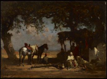| Keywords: Gustave-Achille Guillaumet - An Arab Encampment - 99.197 - Minneapolis Institute of Arts.jpg  small thatch-roofed structure with tree branch supports at right next to a tree; two horses at left next to another tree; turbaned male figures inside structure and one man seated by horses 12 15/16 x 17 3/4 in 32 86 x 45 09 cm canvas 99 197 https //api artsmia org/images/5912/6190/large jpg Q1700481 Oil on panel An Arab Encampment https //collections artsmia org/index php page detail id 5912 Q20891373 |