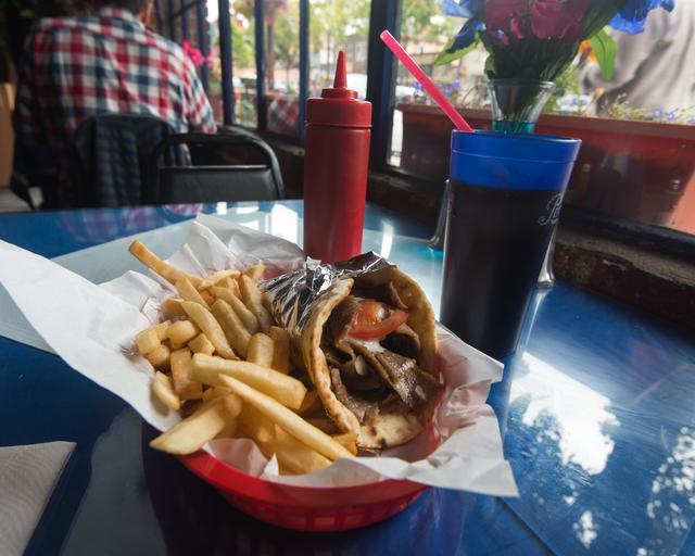 | Keywords: berkeley california united states unitedstates Greek restaurant in Berkeley, with soda and ketchup, at table by window with artificial flowers. My lunch today. Greek restaurant in Berkeley, with soda and ketchup, at table by window with artificial flowers. My lunch today. |