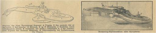 Keywords: Gyrocopter by Papin and Rouilly 1914.jpg Plan of Gyropter invented by Papin and Rouilly from France from Danish magazine Illustreret Familiejournal Illustrated Familyjournal 1914 no 44 p 29 The caption reads Diagram showing the parts of the gyropter A The wing B The central part of the machine C Airchannels D The motor E F The oiltank J The gondola wherein the aircaptain sits K The antenna that ends in the opening L I the lenseshaped body that creates a cushion G Emitteropening for the airstream from the wing The caption on the second picture reads The boomerang flying machine or the gyropter Illustreret Familiejournal 1914 Users reproduction of an expired work of art PD-Art Monocopter 1910s diagrams Inventions Hovercraft in art |