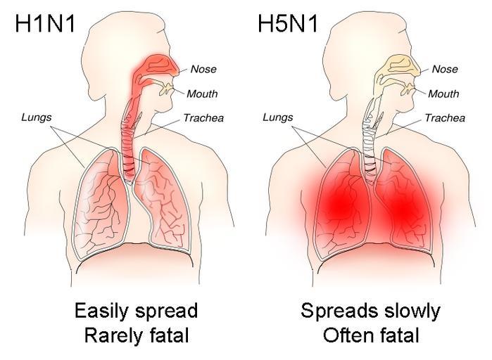 Keywords: H1N1 versus H5N1 pathology.png en Different sites and outcomes of H1N1 versus H5N1 influenza infections Based on Respiratory system svg with annotations own TimVickers 2009-05-03 Diseases and disorders of the respiratory system Influenza