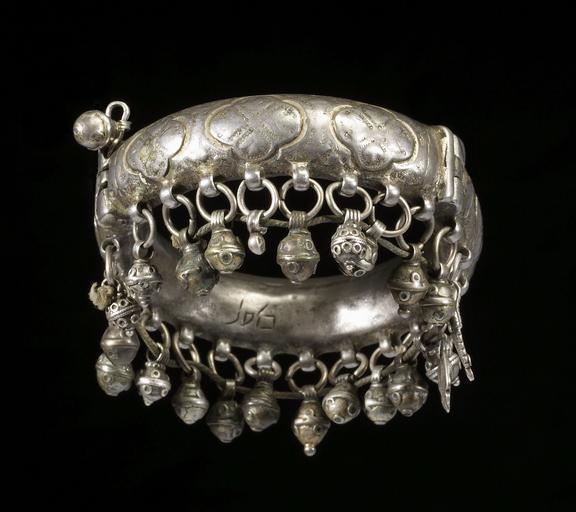 | Keywords: H Kasil - Bracelet - Walters 572319 - View A.jpg The chased bracelet is made of a larger 2/3 and a smaller piece 1/3 that together form a hollow ring The design depicts four-leaf clovers six on the larger piece and three on the smaller piece of the ring The lower rim has twenty-two loops each with a ring and a drop-shaped pendant One pendant is missing This bracelet and Walters 57 2318 are a pair and may have been produced in the same workshop On the inner side of the bracelet is an Arabic stamp with the name of the ruler al-Mahdi The similarity to stamps of al-Mahdi al- Abbas makes it likely that the pendants were produced under his reign from AH 1161 to 1189 AD 1748-1775 In addition a Hebrew inscription is engraved with the name of the silversmith Kasil 1161-1189 AH/AD 1748-1775 silver with gilding Outer diam cm 6 5 ; Inner diam 1 13/16 x W 9/16 in 4 6 x 1 4 cm accession number 57 2319 80923 Mr Benjamin Zucker Zucker Family Trust and Mr Derek Content New York and London by purchase Walters Art Museum Joint gift to the Walters Art Museum Baltimore and the Israel Museum Jerusalem by Mr Benjamin Zucker and Mr Derek Content in honor of Mrs Barbara Zucker and Mrs Amanda Content 2010 Stamp Arabic al-Mahdi Engraving Hebrew Kasil place of origin northern Yemen Walters Art Museum license Jewellery in the Walters Art Museum South Arabian art in the Walters Art Museum H Kasil Media contributed by the Walters Art Museum needs category review Media contributed by the Walters Art Museum needs artist update |