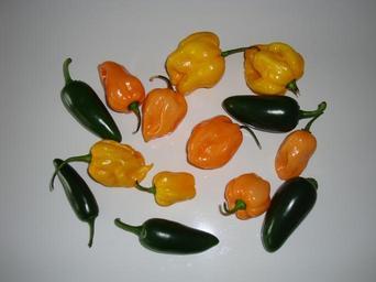 Keywords: Habanero's + Jalapeño's.JPG en Collection of Habanero Yellow and Orange chilipeppers en green Jalapeño's nl Verzameling Habanero Yellow en Orange chilipepers en onrijpe Jalapeño's own Swerfer 2011-08-03 Cc-zero Habanero Jalapeño Unripe fruits |