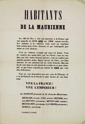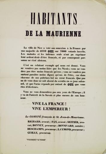 | Keywords: HabitantsdelaMaurienne1860.jpg fr Discours du comité français de Saint-Jean-de-Maurienne avant le vote pour l'annexion Saint-Jean-de-Maurienne 1860 «Cette affiche provient des archives départementales de la Savoie et du site Internet de Conseil général de la Savoie http //www savoie fr/archives73/expo_affiches_1814-1860/ Habitants de la Maurienne - Savoie Saint-Jean-de Maurienne imprimerie Vulliermet 1860 1860 PD-old PD-old Poster of Savoie | ||||