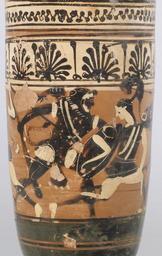 | Keywords: Haimon Painter - Three Amazons and Herakles - Walters 48241 (2).jpg  Herakles is depicted on this black-figure lekythos with his usual attributes the lion skin and the club which he holds in his right hand and a quiver He is facing right grasping an Amazon who tries to escape from him though she turns her head to face him There is an Amazon on each side of this duel One runs away from Herakles while the other runs toward his captive as if coming to her aid All three are similarly dressed; two carry spears; one has no shield Herakles' ninth labor for King Eurytheus required him to retrieve the girdle of the queen of the Amazons While the queen at first willingly acceded to Herakles' request the goddess Hera spread a rumor among the Amazons that Herakles intended to kidnap their queen; when the Amazons attacked him Herakles killed her and made off with her girdle This theme was a common subject on vases depicting the Amazons and one of the most frequently recurring subjects on vases portraying Herakles and his labors In vase-painting the Amazon queen is usually named Andromache she is more often named Hippolyte in the literary evidence and the girdle itself is usually not depicted until after the 6th century ca 525 475 BC terracotta cm 27 8 2 accession number 48 241 27241 Joseph Brummer New York date and mode of acquisition unknown Henry Walters city Baltimore Walters Art Museum Henry Walters Acquired by Henry Walters 1924 Heroes Mortals and Myths in Ancient Greece The Walters Art Museum Baltimore; Frist Center for the Visual Arts Nashville; San Diego Museum Of Art San Diego; Alexander S Onassis Public Benefit Foundation USA New York 2009-2011 place of origin Attica Greece <gallery> File Haimon Painter - Three Amazons and Herakles - Walters 48241 jpg </gallery> Walters Art Museum license Ancient Greek black-figure pottery in the Walters Art Museum Haimon Painter Media contributed by the Walters Art Museum needs artist update Heracles in ancient Greek pottery Amazonomachy in ancient Greek pottery Girdle of Hippolyta |