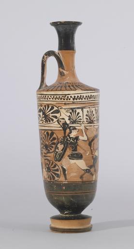 | Keywords: Haimon Painter - Three Amazons and Herakles - Walters 48241 - Left.jpg Herakles is depicted on this black-figure lekythos with his usual attributes the lion skin and the club which he holds in his right hand and a quiver He is facing right grasping an Amazon who tries to escape from him though she turns her head to face him There is an Amazon on each side of this duel One runs away from Herakles while the other runs toward his captive as if coming to her aid All three are similarly dressed; two carry spears; one has no shield Herakles' ninth labor for King Eurytheus required him to retrieve the girdle of the queen of the Amazons While the queen at first willingly acceded to Herakles' request the goddess Hera spread a rumor among the Amazons that Herakles intended to kidnap their queen; when the Amazons attacked him Herakles killed her and made off with her girdle This theme was a common subject on vases depicting the Amazons and one of the most frequently recurring subjects on vases portraying Herakles and his labors In vase-painting the Amazon queen is usually named Andromache she is more often named Hippolyte in the literary evidence and the girdle itself is usually not depicted until after the 6th century ca 525 475 BC terracotta cm 27 8 2 accession number 48 241 27241 Joseph Brummer New York date and mode of acquisition unknown Henry Walters city Baltimore Walters Art Museum Henry Walters Acquired by Henry Walters 1924 Heroes Mortals and Myths in Ancient Greece The Walters Art Museum Baltimore; Frist Center for the Visual Arts Nashville; San Diego Museum Of Art San Diego; Alexander S Onassis Public Benefit Foundation USA New York 2009-2011 place of origin Attica Greece Walters Art Museum license Ancient Greek black-figure pottery in the Walters Art Museum Haimon Painter Media contributed by the Walters Art Museum needs category review Media contributed by the Walters Art Museum needs artist update |