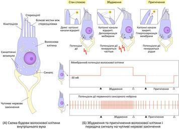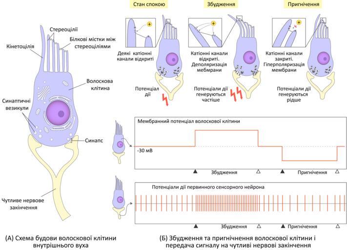 Keywords: Hair cell action.png uk Будова та механізм оботи волоскових клітин А Будова волоскової клітини Б еханізм сп ийняття механічого под азення волосковою клітиною та кодування сигналу чутливим ней оном 2011-06-21 own Zlir'a cc-zero Uploaded with UploadWizard Auditory hair cells |