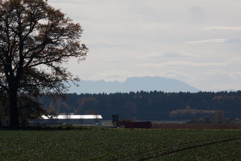 Keywords: hair dryer landscape mountains alpine upper bavaria autumn trees haze blue green yellow orange distant view clouds sky nature