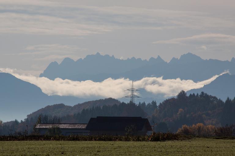 Keywords: hair dryer landscape mountains alpine upper bavaria autumn trees blue grey haze distant view sky nature forest clouds föhn clouds barn transmission mast mast electric pole arable