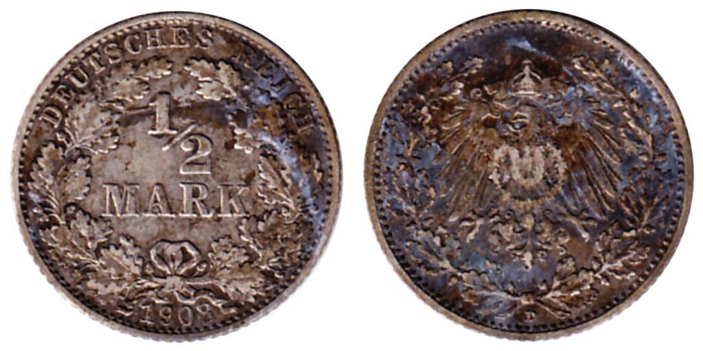 | Keywords: Halbe Reichsmark 1908 VSRS.png en German Coin Value 1/2 Mark 50 Pfennige Date 1908 Front Side Caption Deutsches Reich; Mark Image Digit 1/2 enfolded by oak leaf wreath laced by ribbon Reverse Side Caption D Image Coat of Arms of the German Kaiserreich enfolded by oak leaf wreath Reichsadler / Imperial Eagle looking in left direction wearing a great necklace with cross and holding a heraldic shield showing the prussian coat of arms; the Prussian Eagle is holding the coat of arms of the Hohenzollern; crown with ribbons levitating above its head own McGoinz 2011-02-16 Cc-zero Mark coins of the German Empire 050 1908 coins Wreaths in Germany Coins of the 20th century Reichsadler Coins with a face value of 0 5 |
