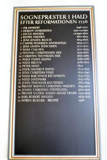 Keywords: Hald Kirke series pastorum.jpg Hald Kirke præstetavle Series pastorum own Own photo 2007-08 Gunnar Bach Pedersen PD Hald Kirke Series Pastorum Other furniture in Danish churches GunnarBach