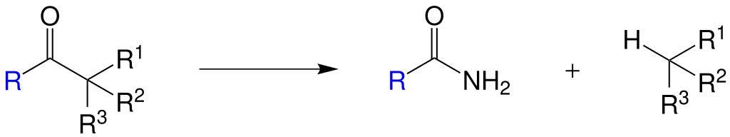 | Keywords: Haller-Bauer reaction Ü2-Seite001.svg en process of the Haller-Bauer reaction if one of the alkyl rests R<sup>1</sup> till R<sup>3</sup> stabilising the molecule de bersichtsreaktion der Haller-Bauer-Reaktion bei der eines der Alkylreste R<sup>1</sup> bis R<sup>3</sup> stabilisierend auf das Molekül wirken own бе еста 2014-02-17 Organic reactions Cc-zero |