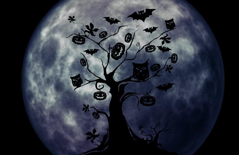 Keywords: halloween tree owl pumpkin weird surreal atmosphere bat moon silhouette
