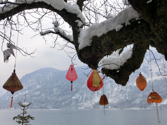 Keywords: hallstatt lake lampion lantern snow winter tree