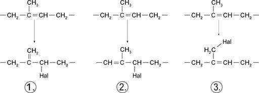 | Keywords: Halobutyl rubber synthesis.png en The process No 1 takes place predominantly hu A halogénezett butilkaucsuk előállítása<br> Elsősorban az 1 számú reakció játszódik le a másik kettő kevéssé ru Получение галогени ованного бутилкаучука<br> П оисходит п еимущественно п оцесс 1 own kifo 2011-07-23 Rubber Cc-zero |