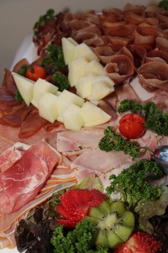 Keywords: ham plate ham cold buffet buffet eat food gourmet gastronomy frisch strawberries kiwi parsley