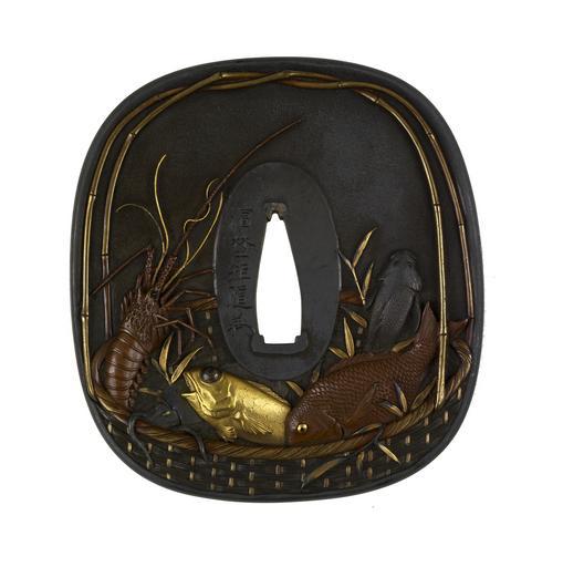 Keywords: Hamano Noriyuki II - Tsuba with Basket of Fresh Seafood - Walters 51128.jpg On the front of this tsuba is a basket of sea food including a spiny lobster and a sea bream Both of these fish are considered celebratory and often eaten as part of New Year celebrations The basket also contains a squid and two additional fish On the back of the tsuba are mushrooms a daikon radish a turnip and a sprig of flowers between 1755 1787 Edo shibuichi gold and copper at bottom of nakago-ana cm 8 5 7 8 ; cm 0 46 d ; width at top of nakago-ana cm 7 4 accession number 51 128 15261 Henry Walters Baltimore date and mode of acquisition unknown Walters Art Museum Henry Walters Acquired by Henry Walters Signature Hamano Noriyuki place of origin Edo present-day Tokyo Japan Walters Art Museum license Tsuba in the Walters Art Museum Hamano Noriyuki II Media contributed by the Walters Art Museum needs category review |
