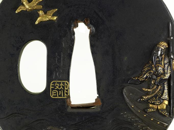 | Keywords: Hamano Noriyuki - Tsuba with the Chinese General Soso - Walters 51124 - Mark.jpg The Chinese Three Kingdoms general Soso Ch Tsao Tsao is shown on his boat crossing the Yangtze River Under a full moon he stood before his soldiers with a spear in his hands and declared that they would be victorious at the coming battle After he spoke two crows flew overhead They are shown here in the upper left Crows are an sign of disaster Soso composed a poem about crows in an attempt to hide the bad omen but was defeated in his battle The reverse shows waves on the shore under a full moon between 1736 1787 Edo shibuichi gold cm 6 6 6 2 accession number 51 124 32919 Henry Walters Baltimore date and mode of acquisition unknown Walters Art Museum Henry Walters Acquired by Henry Walters Signature Hamano Noriyuki; Seal Noriyuki place of origin Edo present-day Tokyo Japan Walters Art Museum license Tsuba in the Walters Art Museum Hamano Noriyuki Media contributed by the Walters Art Museum needs category review |