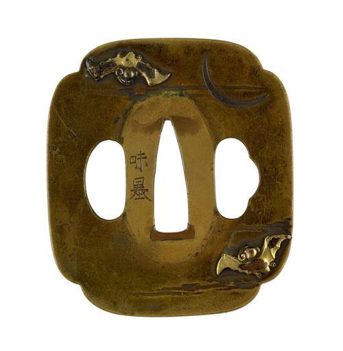 | Keywords: Hamano School - Tsuba with Bats and Crescent Moon - Walters 51229.jpg At the top of this tsuba a bat flies through the night sky A new moon is in on the right A second bat is at the lower right On the reverse incised lines at the lower left indicate water Bats are a symbol of happiness century 18 19 Edo-Meiji sentoku gold silver cm 6 1 5 4 0 39 accession number 51 229 4685 Henry Walters Baltimore date and mode of acquisition unknown Walters Art Museum Henry Walters Acquired by Henry Walters Signature Miboku place of origin Japan Walters Art Museum license Tsuba in the Walters Art Museum Media contributed by the Walters Art Museum needs category review Hamano School |