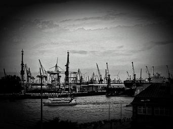 Keywords: hamburg port ships elbe hamburg port hamburg landungsbrücken landungsbrücken water hanseatic city cranes northern germany city black and white port city