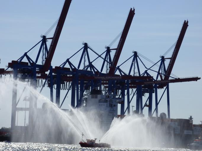 Keywords: hamburg ship water shipyard harbour cranes container port dock water cannon