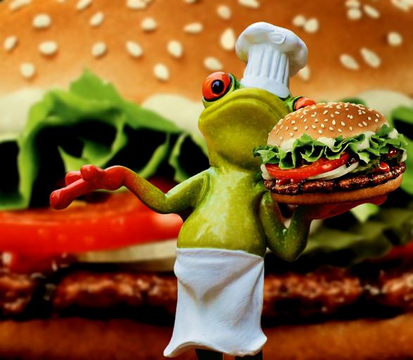 Keywords: hamburger cheeseburger cooking frog funny food preparation chef's hat fig sweet figures cook order call delicious eat cute