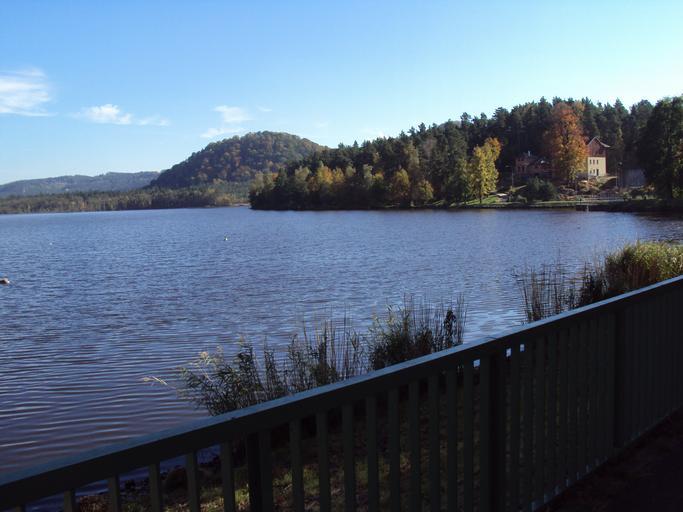 Keywords: Hamerský rybník3.jpg cs Vrch Děvína na pravém kraji Hamerského rybníka víc vpravo špice Hamerského špičáku own Zákupák 2010-10-09 Hamerský rybník Ploučnice